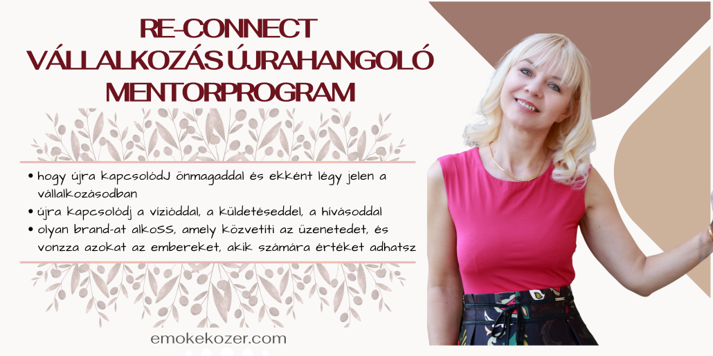 Kozér Emőke vagyok, a RE-CONNECT – Vállalkozás újrahangoló mentorprogram létrehozója. Az elmúlt több mint 5 évben olyan vállalkozókat – terapeutákkal, coachokat, tanácsadókat, egészségügyi és wellness szakértőket, gyógyítókat és tanítókat, valamint jó ügyért dolgozó civil szervezetek vezetőit – kísértem, akik elkötelezettek amellett, hogy segítsenek másoknak átalakítani életüket, karrierjüket, hiedelmeiket, vállalkozásaikat, kapcsolataikat, testüket, környezetüket, vagy akár azt a teret, amelyben élnek és dolgoznak.